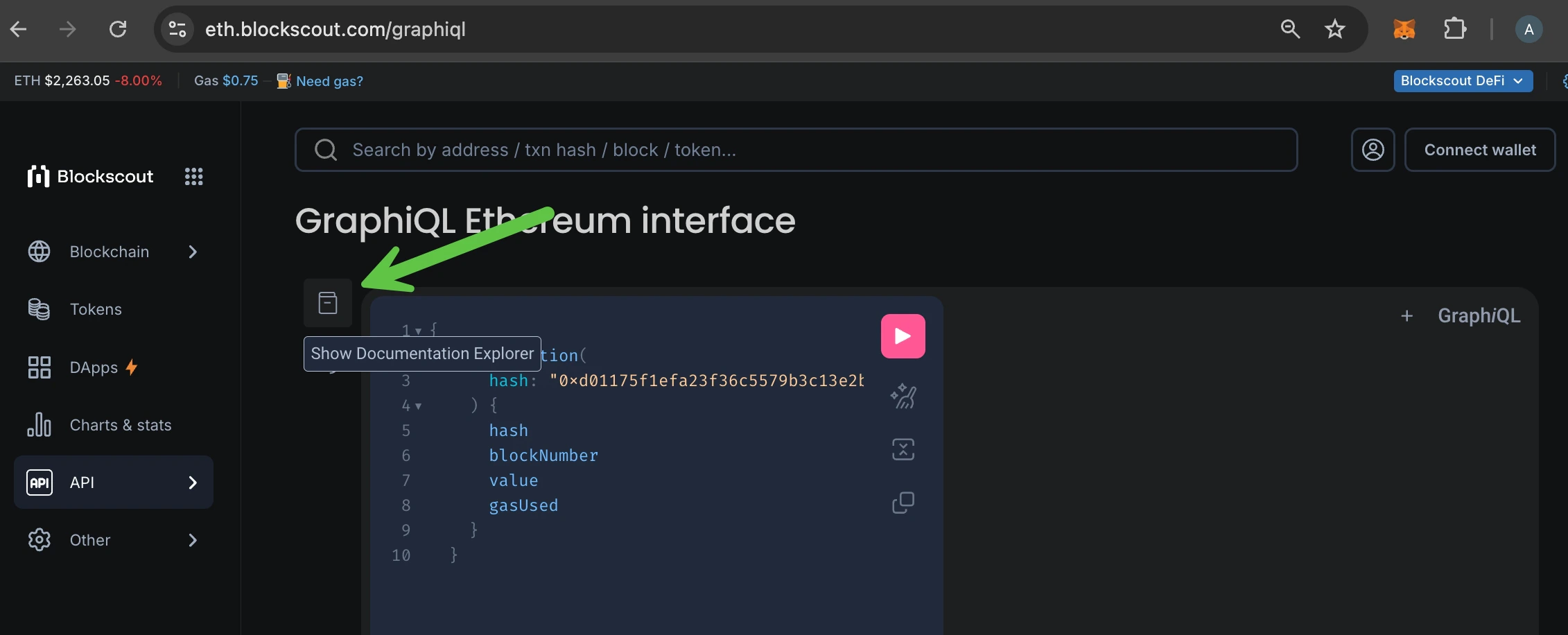 To access Blockscout GraphQL interface you can use GraphiQL - in-browser IDE for exploring GraphQL. It’s built in to Blockscout. From theAPIs dropdown menu choose GraphQL.