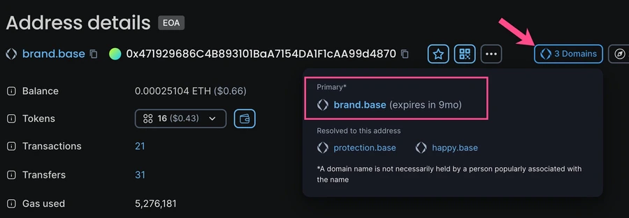 What does 'primary' refer to in the Domains dropdown in the Blockscout UI?