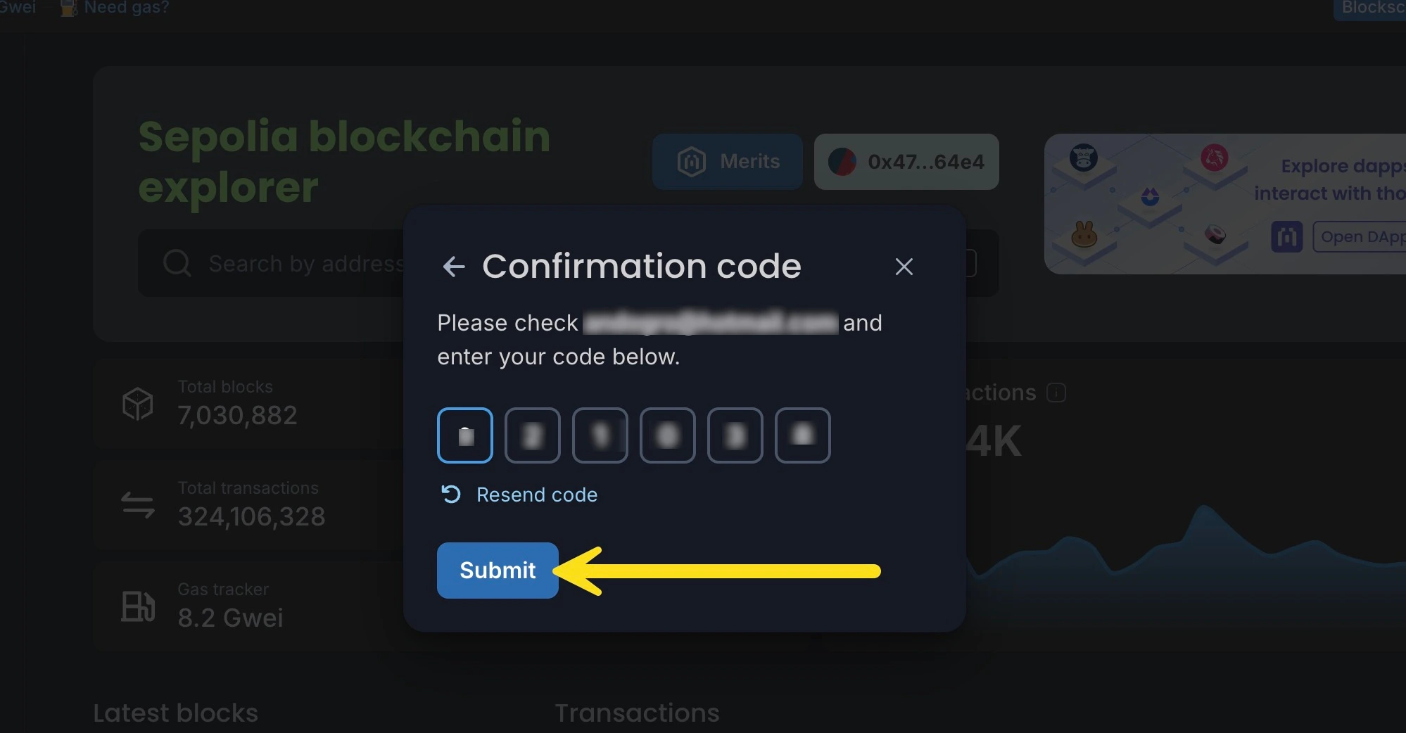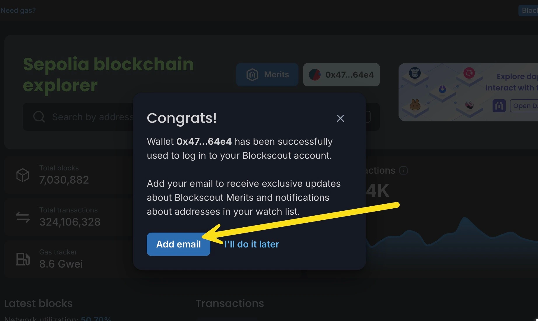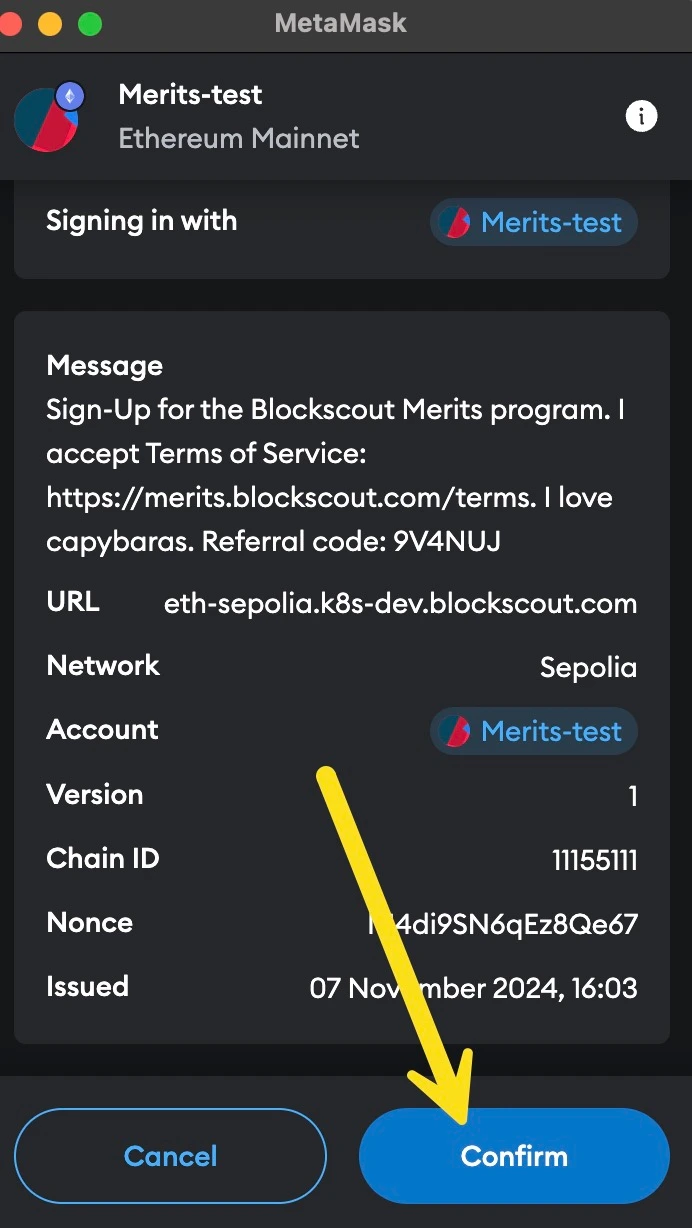 If you already have a Blockscout account, you can still use a referral code to sign up for the Merits program. Login to your Blockscout account and paste in the referral link or press the Merits button to start. Follow the process above starting with step 5.
