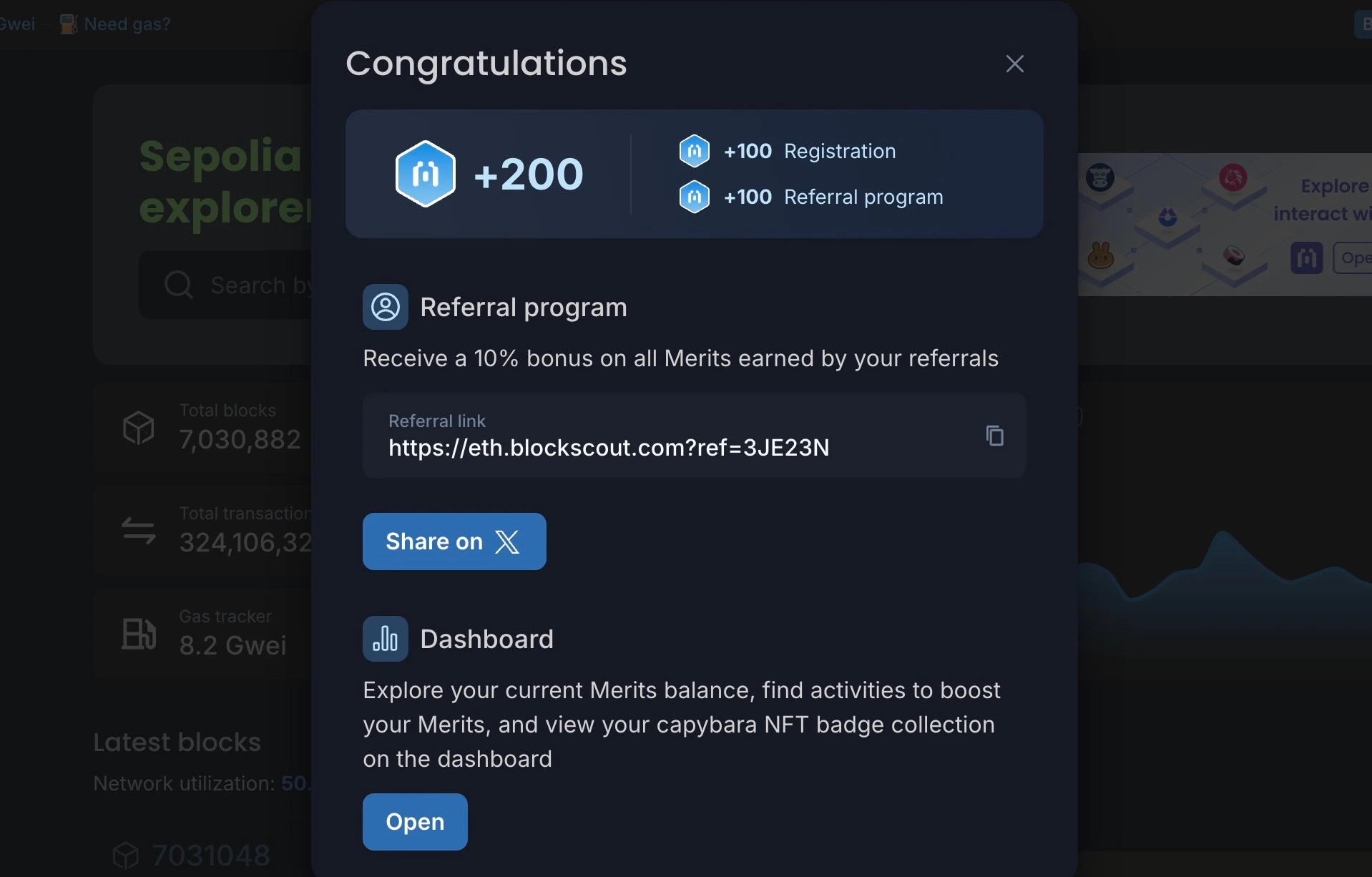 You are now enrolled in the Merits program. You can share your referral link on X, or click Open to view the Merits dashboard.